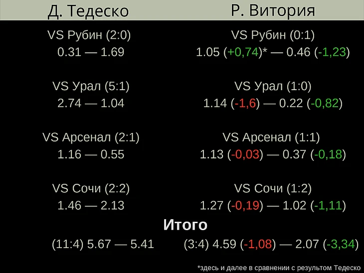 Также можно сравнить матчи прошлогодней команды Тедеско против тех же соперников, с которыми играл Витория (с 4 из 6 команд, так как «Крыльев» и «Нижнего» в РПЛ не было) в том же статусе дома/в гостях. Результат удивляет, как вне контекста сравнения, так и с ним. «Спартак» при Тедеско едва-едва перебил соперников, но забил 11 мячей и набрал 10 очков. «Спартак» Витории же (в разной степени) переиграл каждого из соперников, но забил на 8 мячей меньше, а пропустил столько же. Особенно показательны матчи против «Рубина» (казанцы должны были забирать три очка у Тедеско, зато незаслуженно получили их сейчас) и «Арсенала» (практически идентичные цифры, но разный результат).
