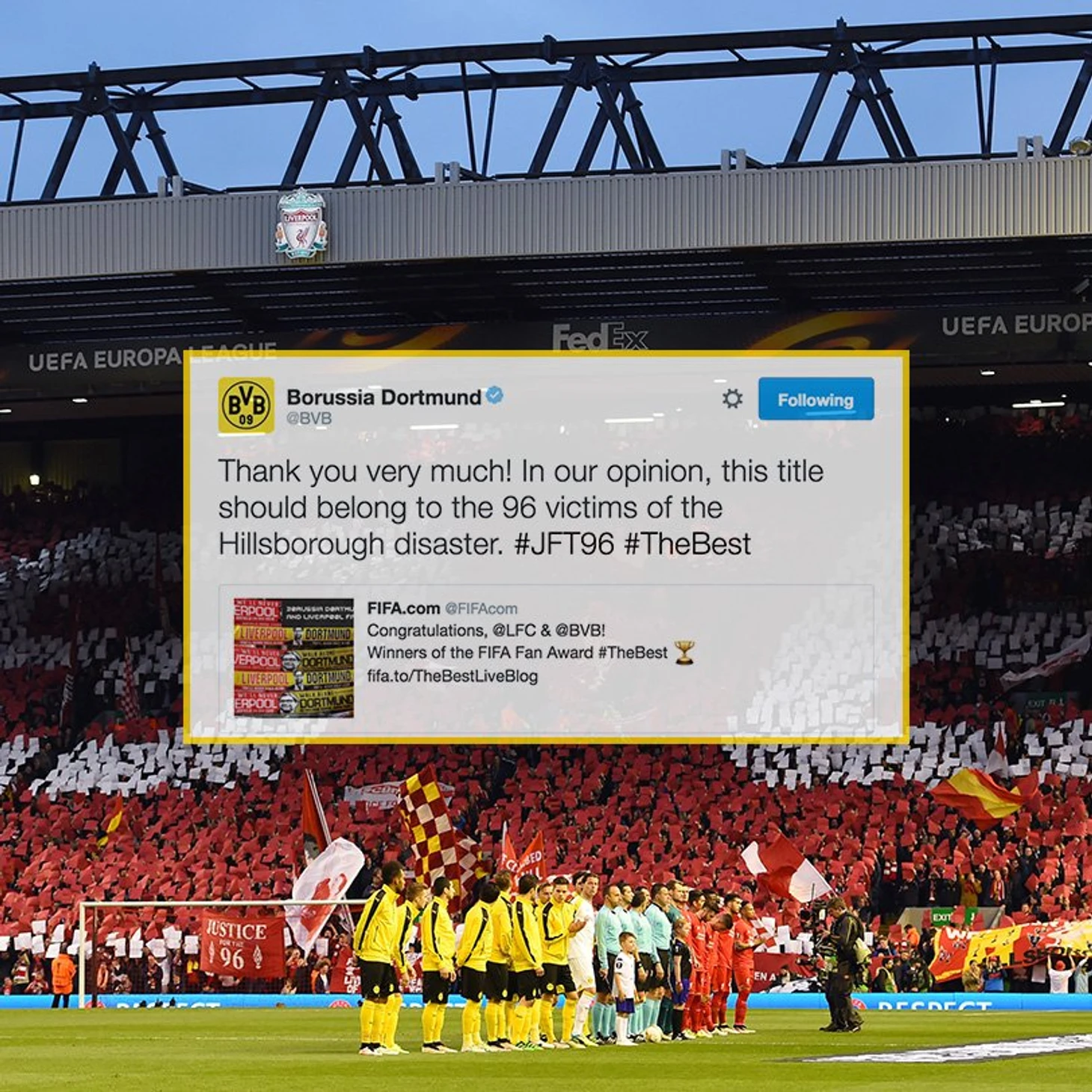 Twitter «Боруссии»: «Спасибо вам огромное! По нашему мнению, этот титул должен принадлежать тем 96 жертвам трагедии Хиллсборо».