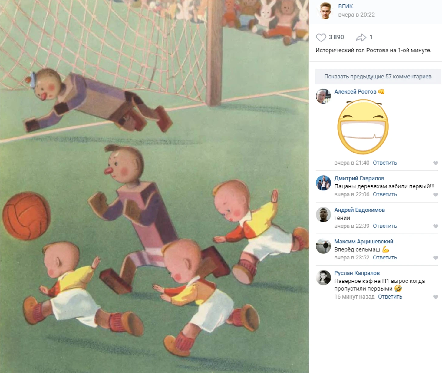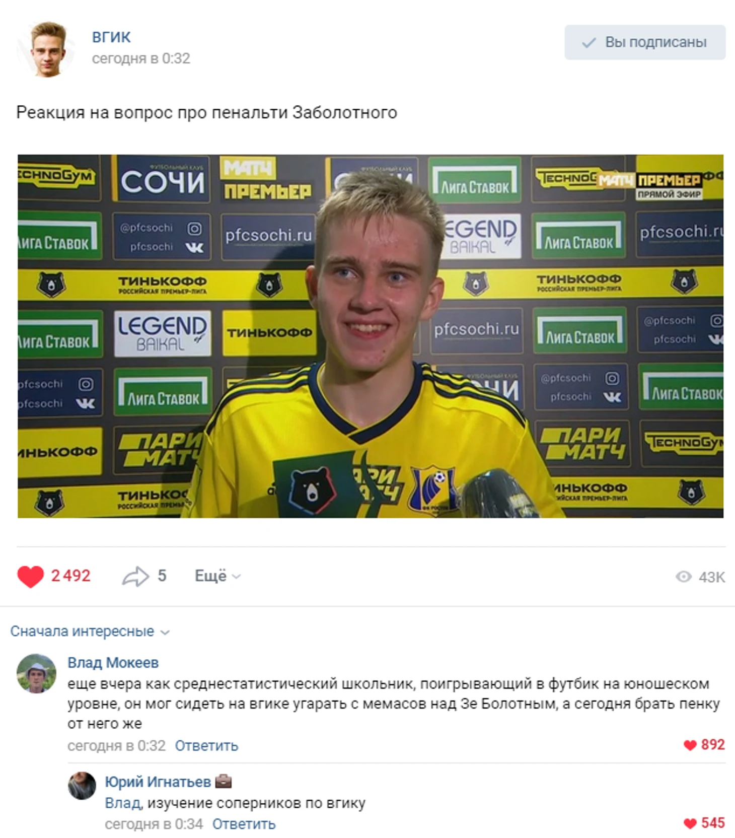 Всё же самый большой респект юный голкипер получил ещё во время игры. Его лицо на аватарку поставил главный поставщик футбольных мемов – паблик «ВГИК».