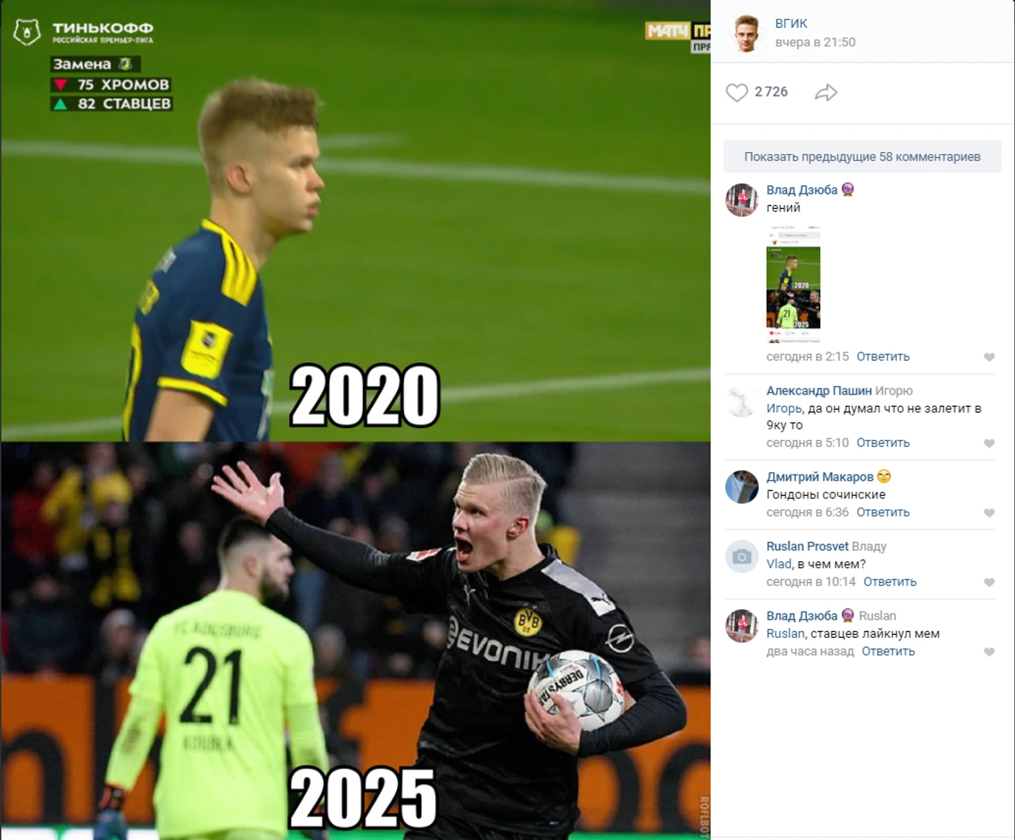На этот раз админы «ВГИКа» усмотрели в лице Максима Ставцева Эрлинга Холланда, наверное, большую роль сыграла причёска.