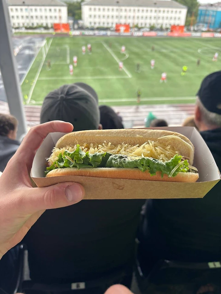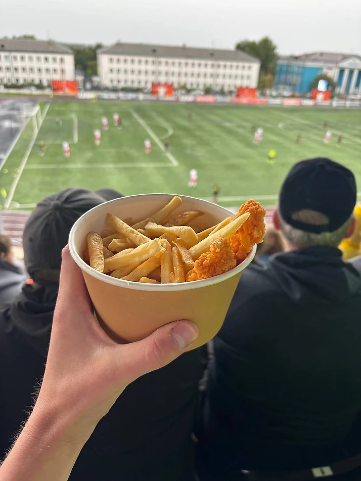 В перерыве я решил перекусить. В буфете под трибунами я взял бокс с курицей, картошкой и рыбными наггетсами, а также попробовал хот-дог, заплатив за всё 680 рублей. В холодную погоду такая еда оказалась как нельзя кстати.
