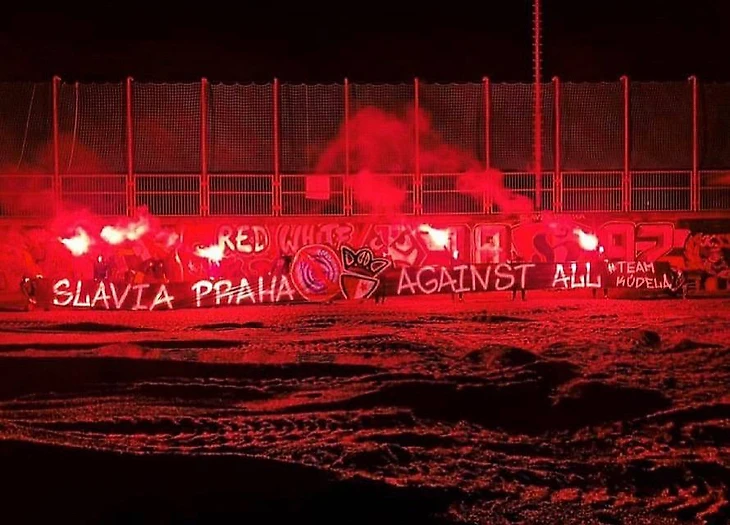 Другим их баннером стало полотно «Славия Прага против всех!» с маленькой подписью «Команда Куделы» справа от основного слогана.