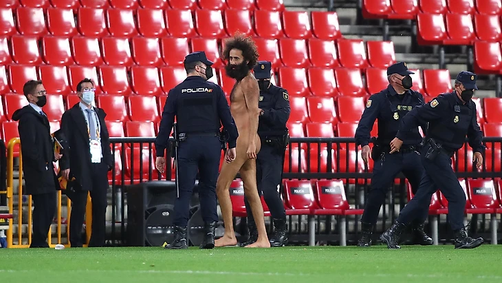 Но на 6-й минуте у матча появился незапланированный участник. Голый мужчина выбежал на поле «Нуэво Лос Карменес» и рухнул на траву. Вскоре его увела полиция.