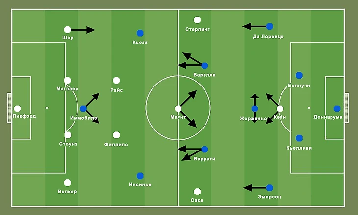 Англия Саутгейта прекрасно подходит под сдерживания атакующих действий Италии. Причем в любой схеме, в любой расстановке игры англичане не дадут ключевого пространства на флангах за счет двух прекраснейших выносливых и сильных опорников - Райса и Филлипса, которые сделали Англию непробиваемой.