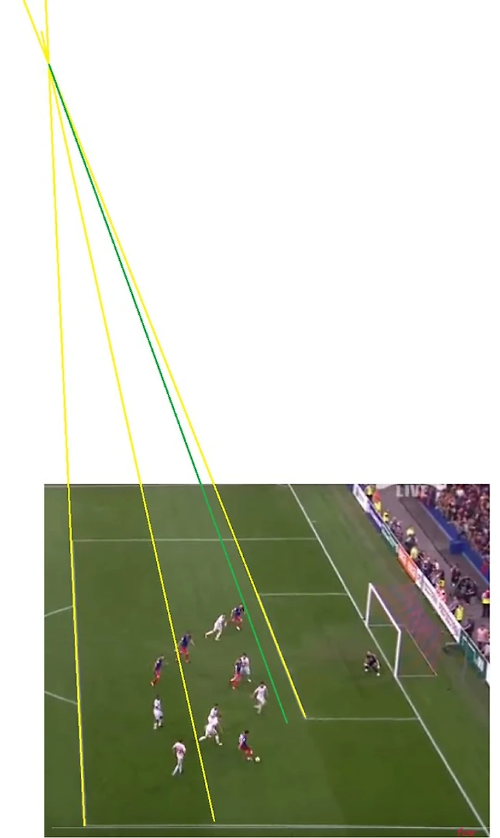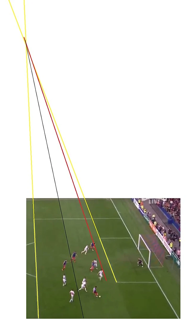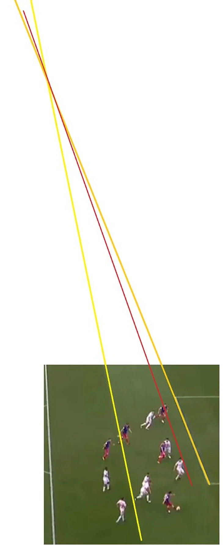 Или можно взать линию газона и вратарскую и найти перспективную прямую.
