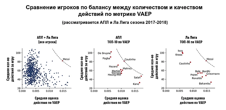 Пунктирная линия (изолиния или линия уровня) на первом и третьем графиках показывает какой отрыв имеет Месси по рейтингу VAEP от других игроков как внутри Ла Лиги, так и относительно игроков АПЛ и в тоже время отражает то, что Месси демонстрирует удивительный баланс между количеством и качеством действий.