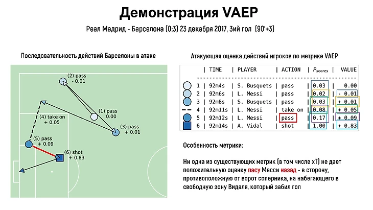 В качестве основного примера предлагается рассмотреть концовку матча между Реалом и Барселоной в декабре 2017 года, для которой приводится оценка 6 действий по метрике VAEP, после которых был забит последний гол в матче.