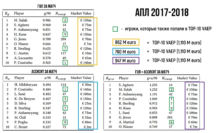 Ниже приведены 3 таблицы, в которых составлены рейтинги футболистов для АПЛ сезона 2017-2018 по базовым метрикам – количество голов за матч, количество ассистов за матч и количество голов + ассистов за матч. Для каждой из метрик приведены 10 лучших футболистов. Также в таблицах представлены соответствующие рейтинги по метрике VAEP (номер футболиста в рейтинге) и трансферная стоимость по окончанию сезона.