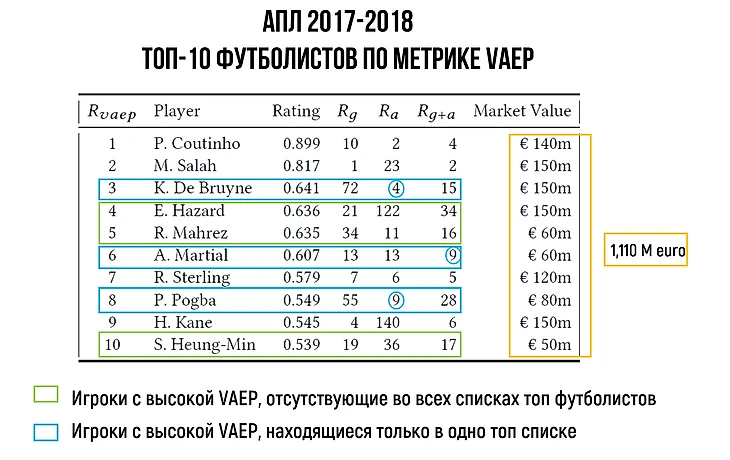 В таблице ниже приводится рейтинг TOP-10 футболистов по метрике VAEP. Можно выделить 3 звезд АПЛ, которые не попали ни в один из предыдущих рейтингов, но получили высокую оценку по метрике VAEP – Азар, Марез и Сон Хын Мин. Также стоит обратить внимание на 3 футболистов, которые оказались только в одном из рейтингов с базовыми метриками, но получили высокие оценки по показателю VAEP - Де Брюйне, Марсьяль и Погба. Качественно оценить эффективность метрики VAEP можно в том числе сравнив результирующую суммарную трансферную стоимость базовых рейтингов с рейтингом составленным по метрике VAEP, который на 17% выше, чем рейтинг по метрике гол + пас, являющийся самым объемным в деньгах из базовых рейтингов.