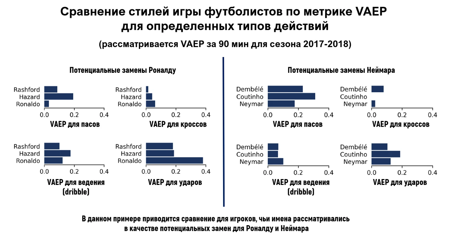 Ниже приведены конкретные примеры, в одном из которых предлагается сравнение ряда игровых характеристик по метрике VAEP для Дембеле и Коутиньо, которые были приобретены Барселоной после ухода Неймара на его позицию.