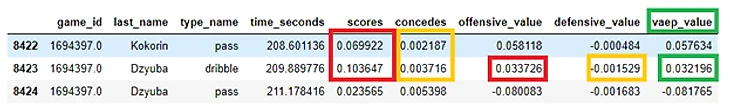 Ниже приведен пример полноценного расчета метрики VAEP на примере одного действия Дзюбы (dribble - ведение мяча) в матче чемпионата Европы 2016 года против Англичан. Можно наблюдать, что перед этим действием Дзюба получил пас от Кокорина, столбец scores отражает, как изменилась вероятность забить гол после действия Дзюбы, столбец concedes - как изменилась вероятность пропустить гол. Столбец offensive value - атакующая оценка действия - разница двух последних вероятностей забить гол - вероятность возросла на 0.03 (3%), столбец defensive value - оценка оборонительного действия - разница двух последних вероятностей пропустить гол со знаком минус (т.е. вероятность возросла на 0.0015 (~ 0.2%), для того чтобы получить итоговое значение VAEP мы должны вычесть из вероятности забить гол - вероятность пропустить, поэтому добавляется знак минус). Последний столбец - итоговое значение метрики VAEP.