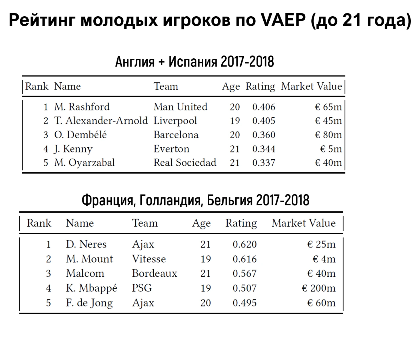 С помощью метрики VAEP был составлен рейтинг молодых футболистов (были оценены игроки с датой рождения после 1 января 1997, сыгравшие в течение сезона не менее 900 мин). Идея была в том, чтобы сравнить VAEP метрику для лучших молодых игроков из топ европейских дивизионов, в которых игроки находятся в сильной конкуренции, и зачастую не имеют много игрового времени, и ту же метрику для лучших молодых игроков из лиг с более низким рейтингом. В качестве топ лиг были рассмотрены АПЛ и Ла Лига. В качестве лиг второго эшелона – чемпионаты Франции, Бельгии, Голландии. Полученные результаты приведены в таблицах ниже.