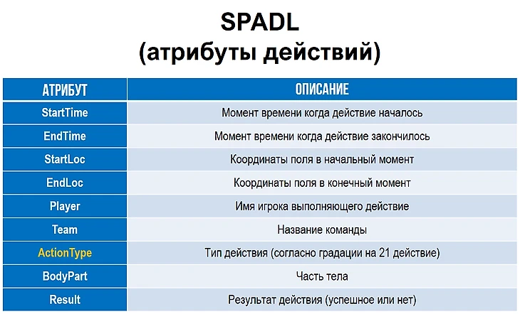 Предложенная авторами концепция описывает всю игру как последовательность действий с мячом, каждое действие футболиста представляется набором 9 атрибутов (признаков или полей), представленных ниже.