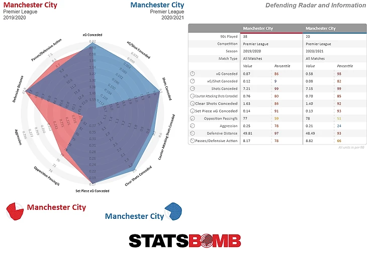2. Оборонительный радар для Манчестер Сити (текущее состояние команды - после 20 тура vs команды прошлого сезона 2019-2020)