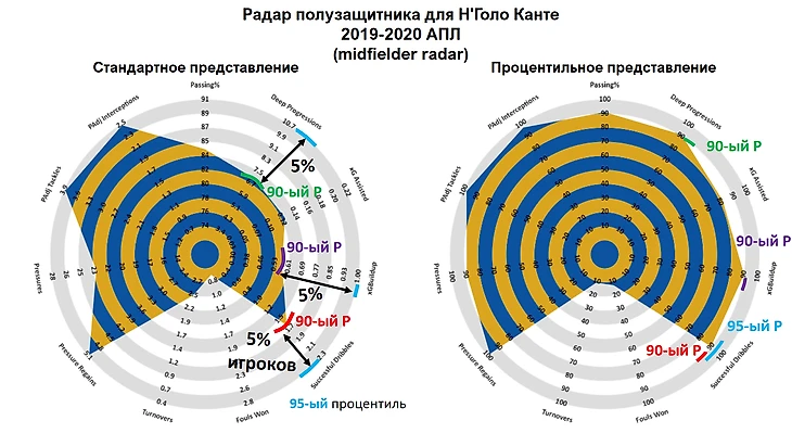 По правому радару мы видим, что значение данной метрики соответствует 90-му процентилю распределения, т.е. результат Канте лучше, чем у 90% всех футболистов, показатели которых были учтены при построении радара. Получается, что для данной метрики следующие 5 линий уровня после линии со значением 6.7 соответствуют 5% футболистов, находящихся между 95-ым и 90-ым процентилями.