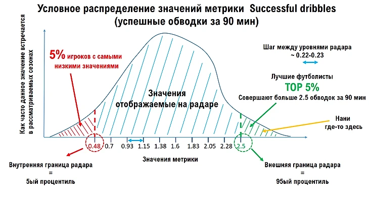 На радаре выделяют внешнюю границу и внутреннюю границу, которые отделяют 95-ый и 5-ый процентиль распределения для каждой метрики, отображаемой на радаре. Понятие процентиля следует понимать, чтобы корректно трактовать информацию на радаре, в нем нет ничего сложного. Процентиль - это граница, отделяющая определенный процент значений всего распределения, т.е. 95-ый процентиль отделяет 5% лучших футболистов для рассматриваемой метрики, или по-другому можно сказать, что 95% игроков имеют более низкое значение данной метрики. Если абсолютное значение метрики превышает верхнюю границу радара, то это значит, что футболист вошел в TOP 5% игроков по данной метрике и на радаре значение метрики для него отмечается на внешней границе, несмотря на то что фактически превышает ее. 5-ый процентиль отделяет 5% игроков с самыми низкими показателями по данной метрике. На радарах 5-му процентилю соответствует внутренняя граница, для которой абсолютное значение обычно не указывается, но может быть оценено исходя из величины шага между уровнями радара. Величину шага можно рассчитать примерно, т.к. на радаре приводятся уже округленные значения для метрик. Если абсолютное значение метрики находится ниже внутренней границы радара, то это значит, что футболист вошел в 5% игроков с наихудшими результатами по данной метрике. Ниже приведено условное распределение метрики Successful dribbles для рассмотренного ранее радара, чтобы продемонстрировать понятие процентилей более наглядно.