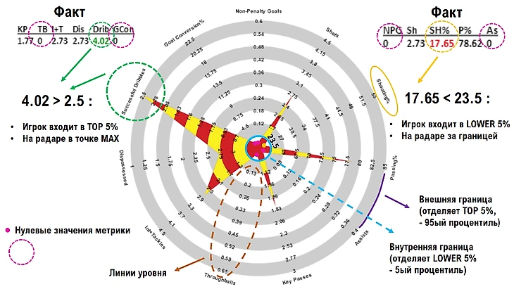 Т.е. имея перед глазами только один лишь стандартный радар игрока и не зная вид исходного распределения значений метрики или процентиля, мы не можем качественно оценить его уровень относительно всей выборки футболистов, если значение метрики для него лежит между внешней и внутренней границами.