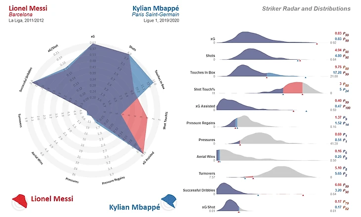 Ниже представлен актуальный пример того, как StatsBomb публикует такие сравнения. Обычно такие сравнения проводятся для игроков относительно одного и того же промежутка времени, в данном же случае пример больше демонстрационный. На радаре ниже сравниваются Месси сезона 2011-2012 и Мбаппе прошлого сезона 2019-2020.