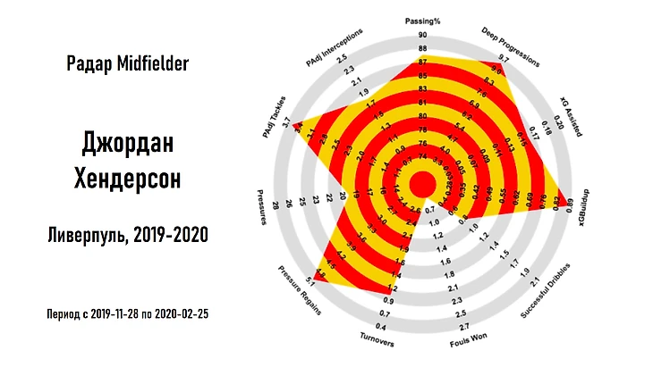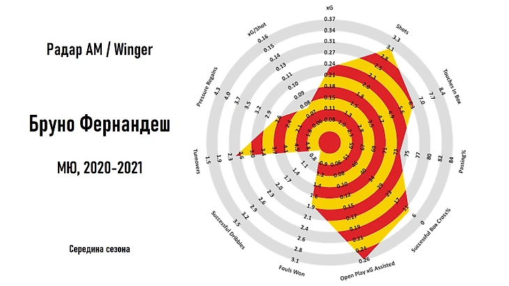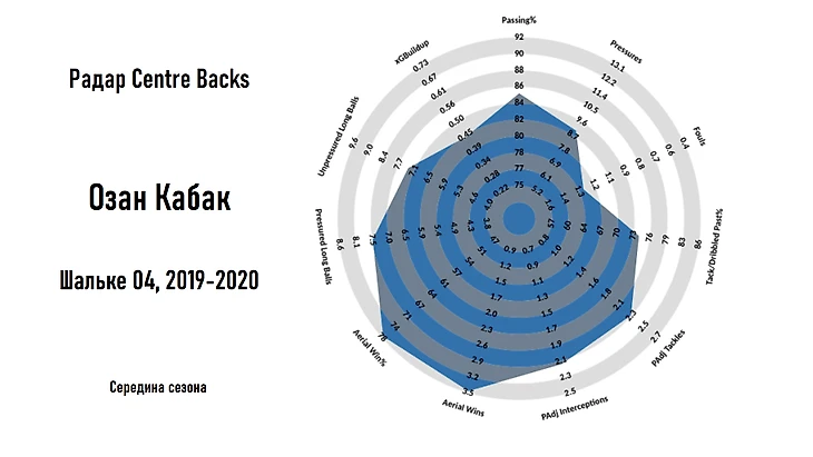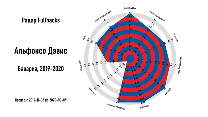 Для построения радара используются значения метрик, полученных на основе анализа последних 5 сезонов для ведущих европейских лиг (АПЛ, Бундеслига, Ла Лига, Серия А, Лига 1) и рассчитанных для 90 минут игрового времени.