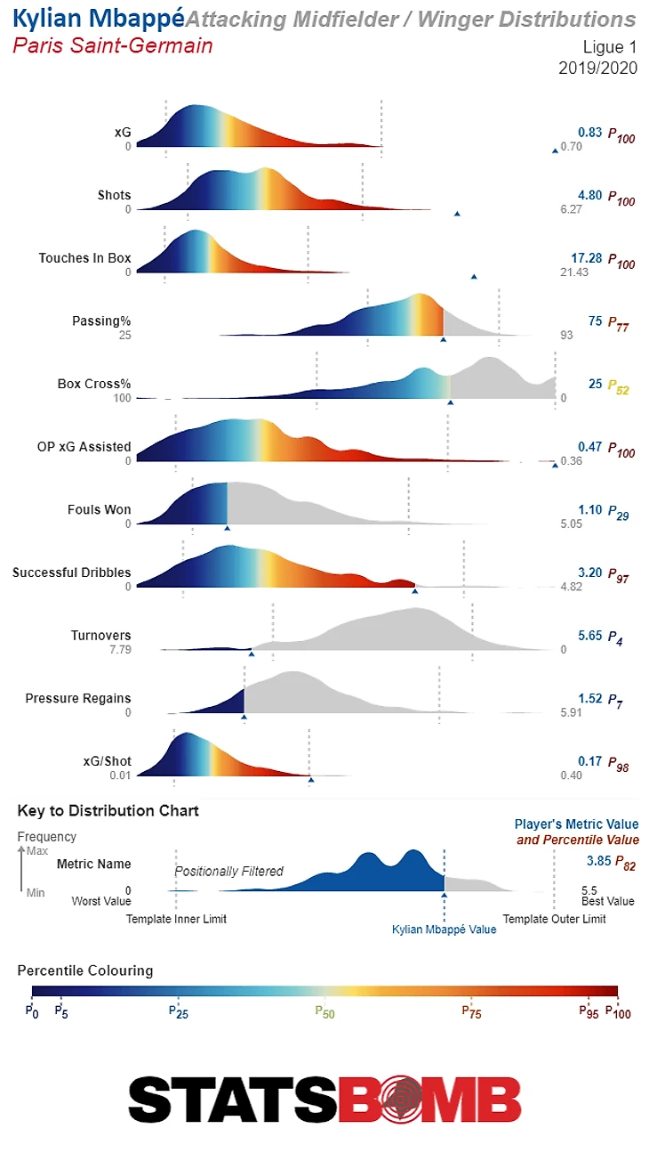 Все вышесказанное привело к тому, что StatsBomb стали сопровождать свои радары футболистов соответствующим набором распределений для всех используемых метрик. Это было сделано для того, чтобы снизить возможность неверной интерпретации радаров, широко используемых как простыми любителями футбола для сравнения различных игроков друг с другом, так и профессиональными представителями индустрии футбола - скаутами, аналитиками, сотрудниками футбольных клубов и непосредственно игроками.