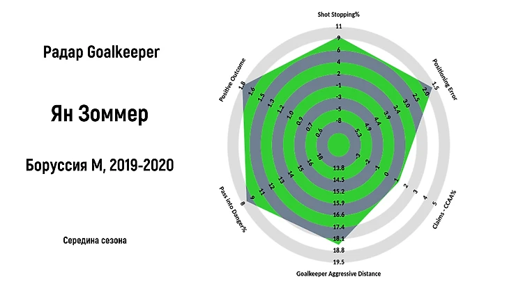 Более полную информацию по данному радару можно найти по ссылке. Для вратарей рассматривается отдельный набор метрик. Некоторые из изложенных метрик могут показаться не такими интуитивными, как те, которые были рассмотрены ранее. Нужно понимать, что задача оценивания действий вратарей оказалась более трудной, чем оценивание эффективности других игровых амплуа, и на данный момент в индустрии нет какого-то универсального инструмента, имеющего хорошую предсказательную силу и удобного для проведения качественного анализа.