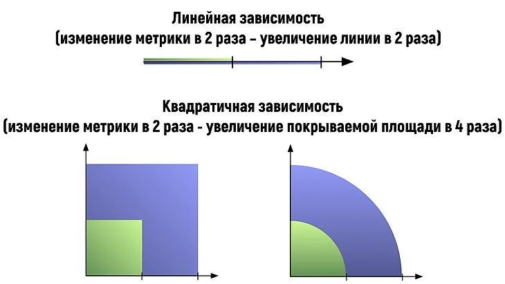 Специфика восприятия информации на радаре путем оценки площади, которую покрывает сформированная зона для игрока, заключает в себе еще один нюанс, который нужно принимать во внимании при анализе радаров. При линейном увеличении значения метрики или при переходе между соседними линиями уровня, площадь, покрываемая радаром, увеличивается нелинейно. Т.е. если вы увеличите значения всех метрик, представленных на радаре, вдвое, то покрываемая площадь увеличится в 4 раза (т.е. присутствует квадратичная зависимость площади радара от значений метрик).