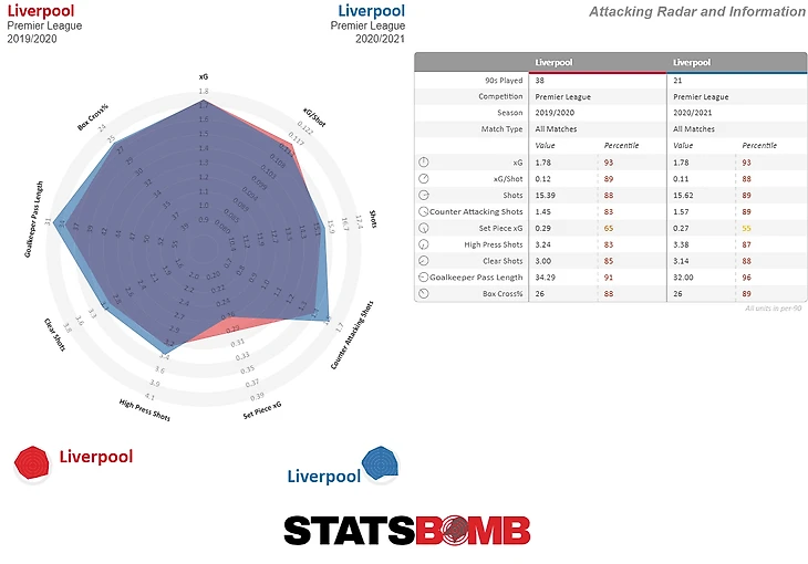 1. Атакующий радар для Ливерпуля (текущее состояние команды - после 21 тура vs команды прошлого сезона 2019-2020)