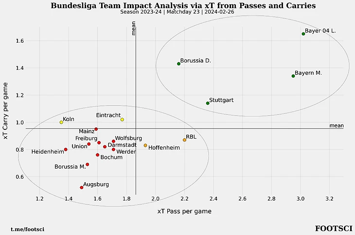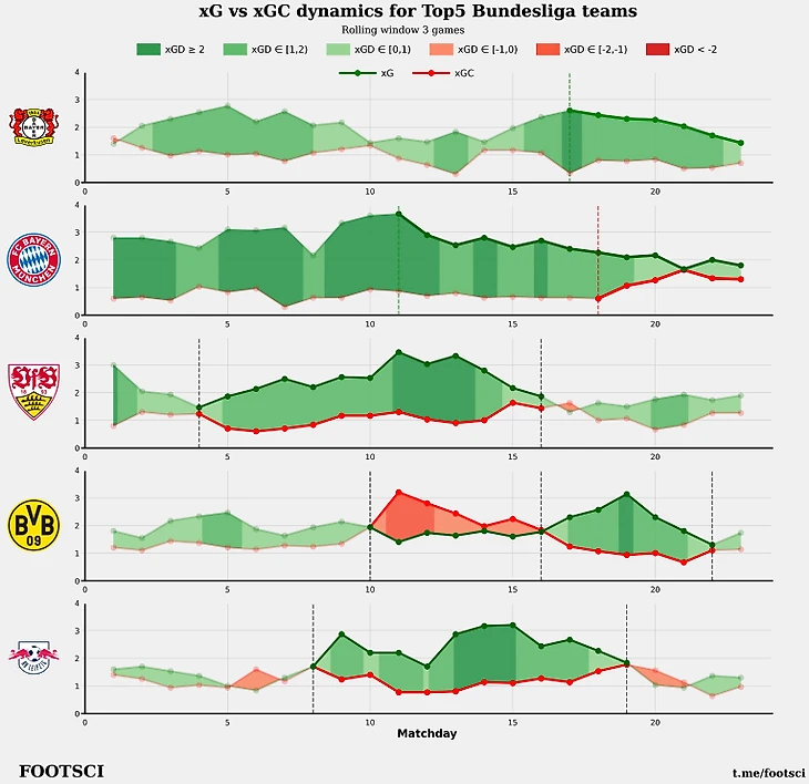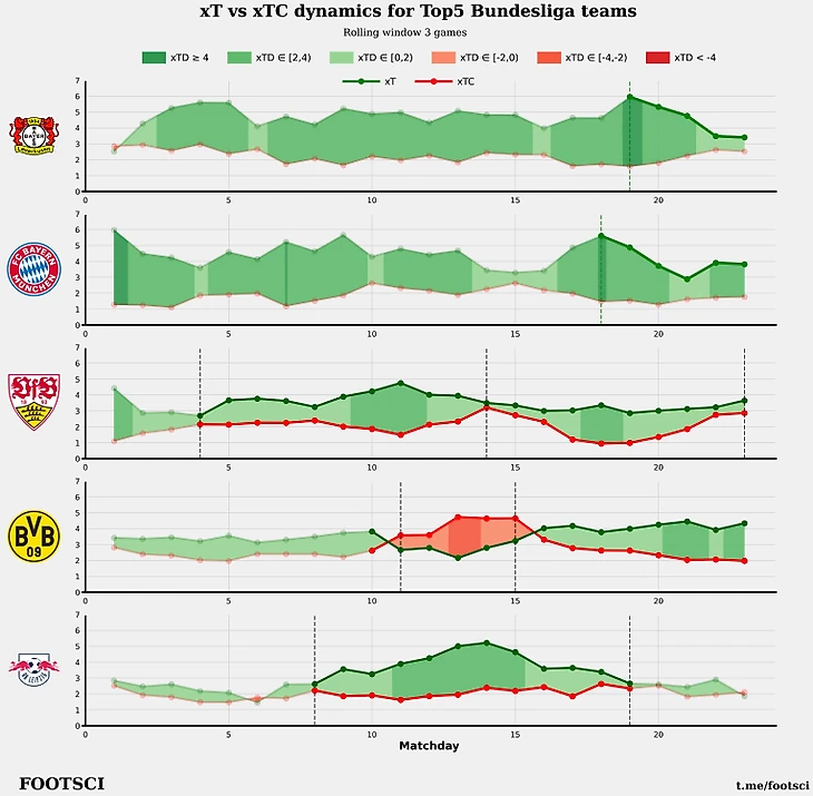 Можно попробовать найти ответ при анализе динамики xT на уровне команд. Ниже для ТОП5 клубов в чемпионате Германии рассмотрено изменение набираемых xT у ворот соперника против xT допускаемых у своих ворот по ходу текущего сезона.