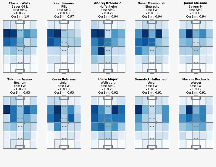Ниже приведены карты активности для немца и 9 игроков Бундеслиги, которые наиболее близки к паттерну действий Флориана (здесь рассматриваются только успешные передачи и продвижения мяча).
