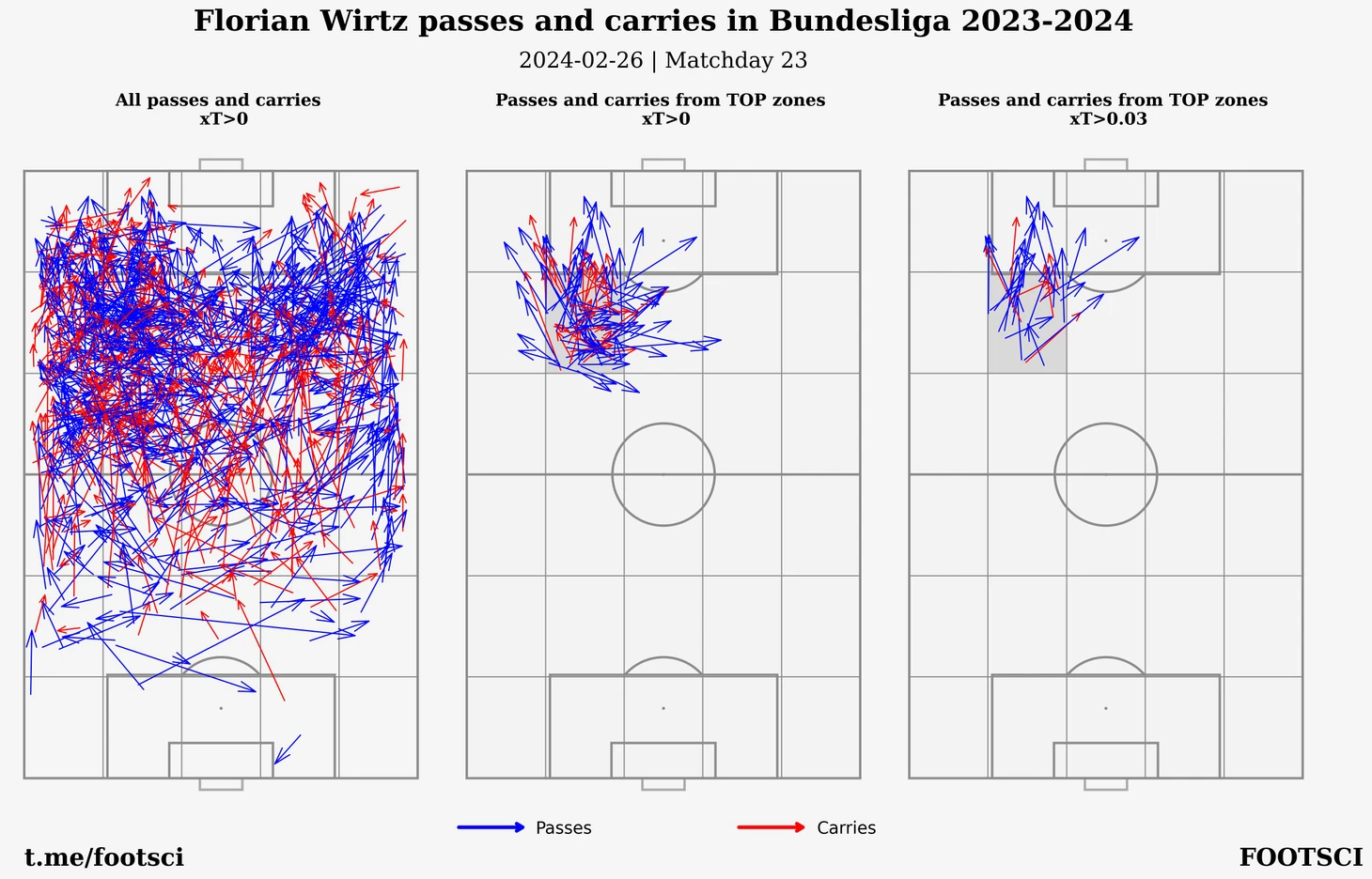 Наконец предлагаю рассмотреть аналогичную визуализацию для Виртца. Зона, из которой немец создает опасные моменты больше других, находится на левом полуфланге непосредственно перед штрафной площадью соперника. На картинке ниже можно наблюдать как именно Флориан перемещает мяч в штрафную.