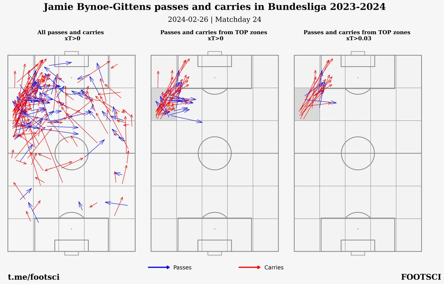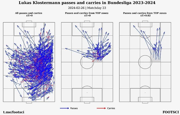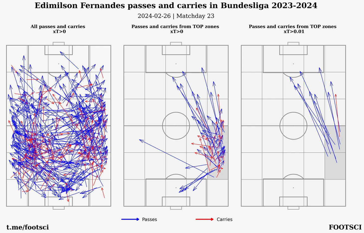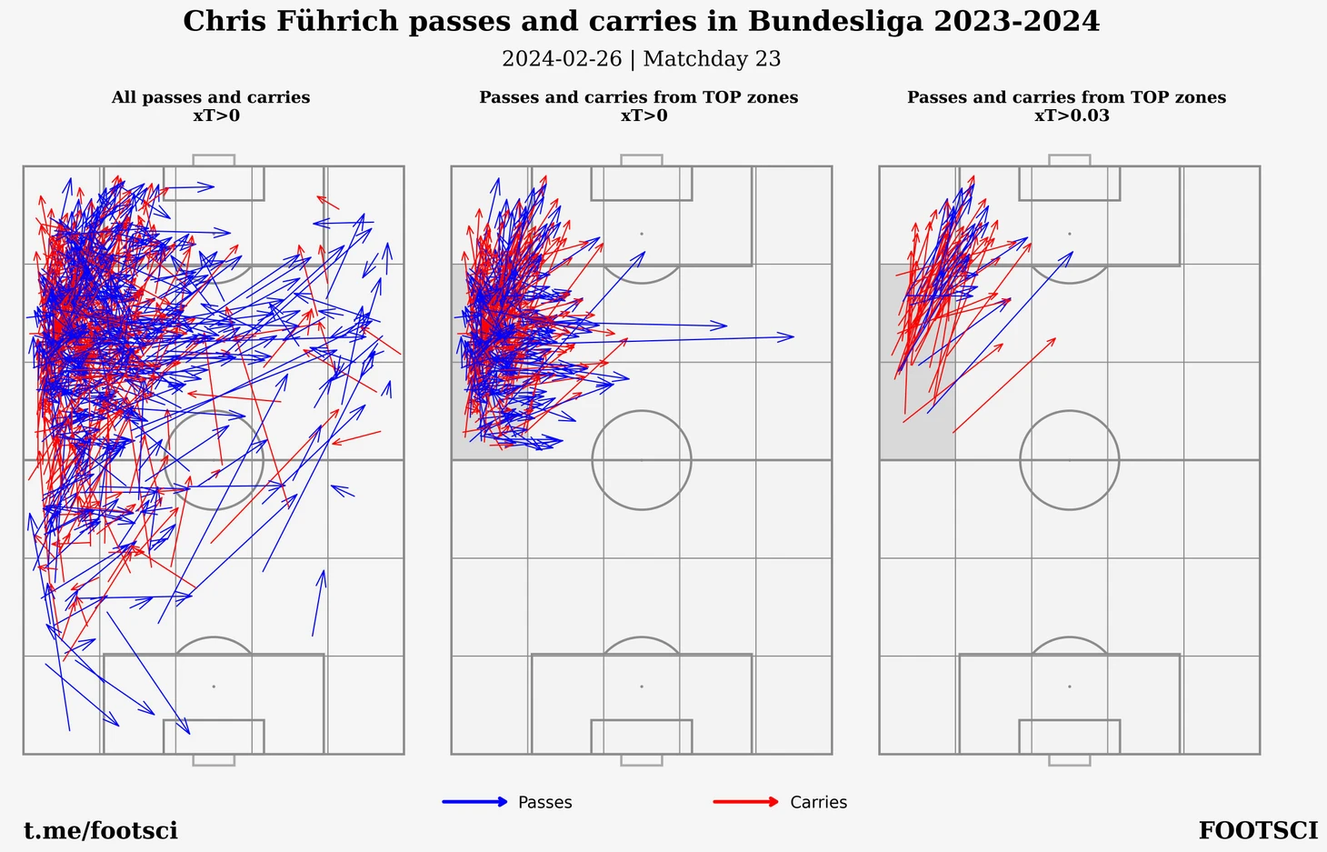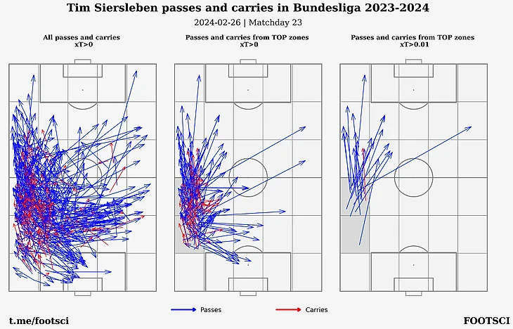 Штутгарт присутствует в трех зонах, причем большую часть левого фланга на половине соперника почти целиком занимает Крис Фюрих. Ниже приведена карта действий, которыми он заработал соответствующие оценки по xT. Слева - все действия с xT > 0, по середине - отфильтрованы действия только из зон, где немец стал лучшим и справа приводятся самые опасные передачи и продвижения, каждое из которых больше 0.03.