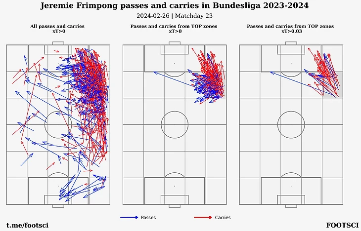 Если сравнить показатели немца с лучшими игроками Англии и Испании, то он с 0.77 xT занимает третье место после Доку и Винисиуса с 1.12 и 0.79 xT за 90 минут. При этом Флориан номинально чаще всего играет центрального атакующего полузащитника с некоторым перевесом в зону левого полуфланга в отличие от Доку и Винисиуса, которые создает основную угрозу непосредственно с фланга.