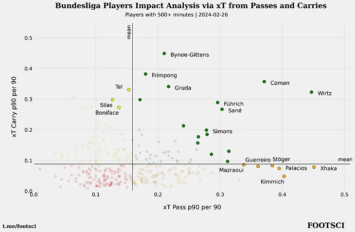 Также хочется еще раз выделить Виртца и указать на то, что его показатели являются довольно сбалансированными. На первом месте в аналогичных рейтингах для в АПЛ и ЛаЛиги находятся игроки, которые большую часть по xT набирают через дриблинг.