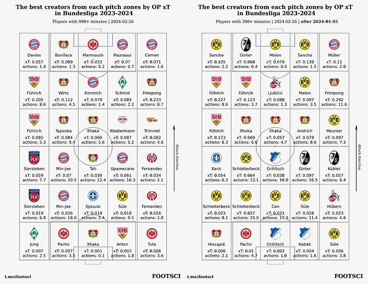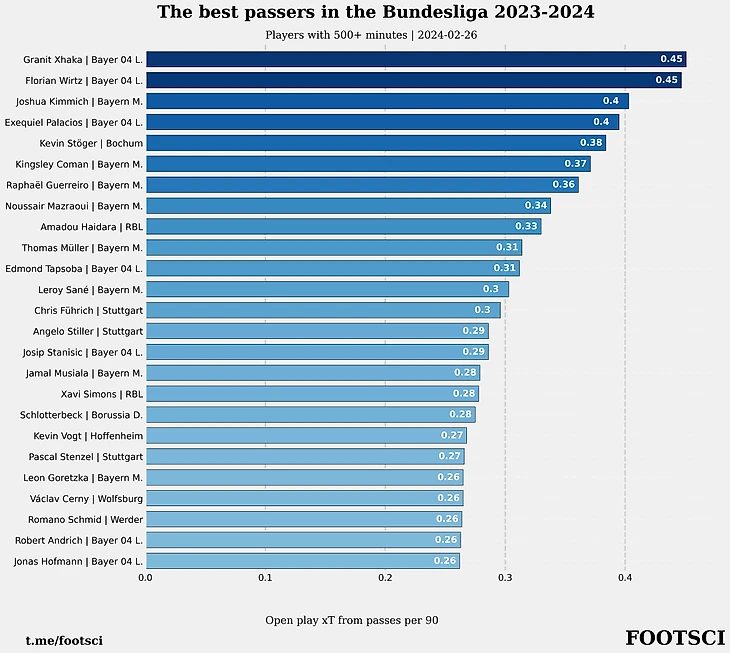 Флориан Виртц - занимает первое место в общем рейтинге и делит первую строчку в отдельном рейтинге лучших распасовщиков лиги по xT со своим одноклубником Гранитом Джакой. На текущий момент имеет 5 забитых голов и 10 передач, являясь вторым ассистентом в чемпионате.