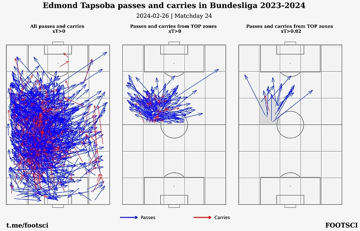 Тапсоба в рассмотренной тройке игроков делает больше всех действий, набирая свои 0.084 xT за матч преимущественно за счет коротких передач в соседние зоны.