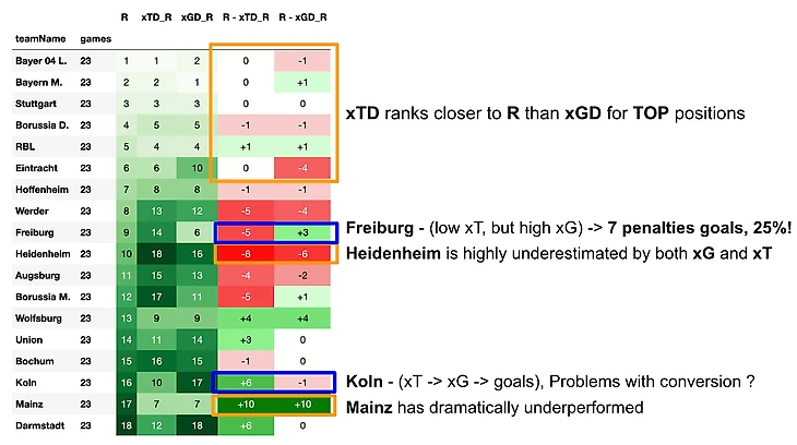 Аномалию с Фрайбургом пожалуй объяснить легче. Команда забила больше всех пенальти в Бундеслиге, которые к тому же составляют существенную часть всех забитых голов - 25%. Данная особенность отражается сразу на обоих метриках. За пенальти игрок и команда получают высокие базовые 0.79 xG. Однако эта оценка никак не учитывается в xT.