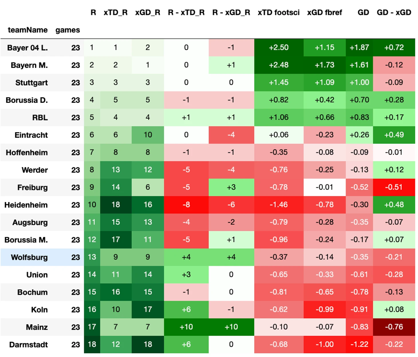 Кёльн по разнице xT имеет +6 от фактического места. Это говорит о том, что в сравнении с другими командами схожего перформанса козлы неплохо перемещают мяч в опасные зоны, однако не могут конвертировать моменты в опасные удары (место по xG хорошо согласуется с реальным) . Чисто на цифрах опрометчиво делать какие-то еще выводы. Дальнейший анализ должен безусловно дополнятся фактическим просмотром матчей.