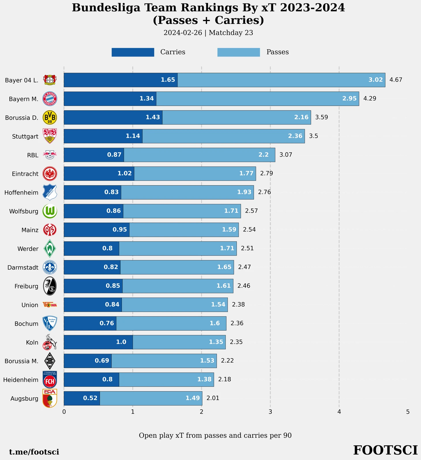 Бавария проигрывает Байеру по xT для carries, который зарабатывается частым перемещением мяча в более опасные зоны у ворот соперника.