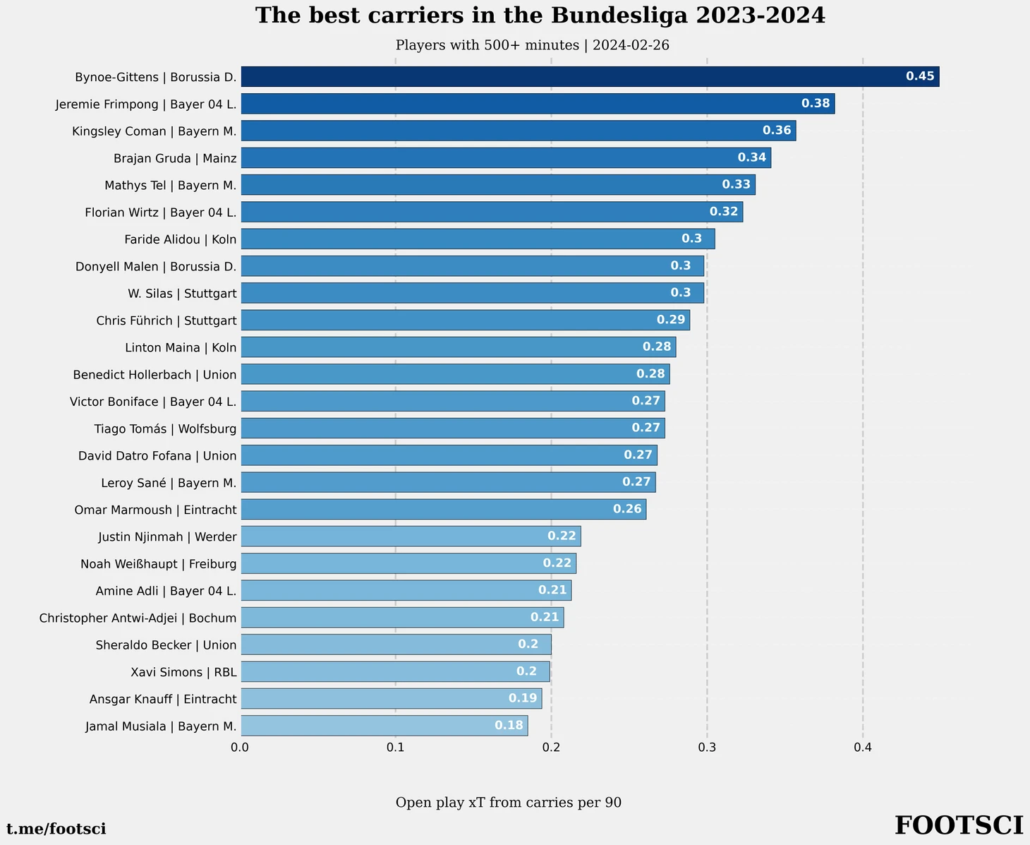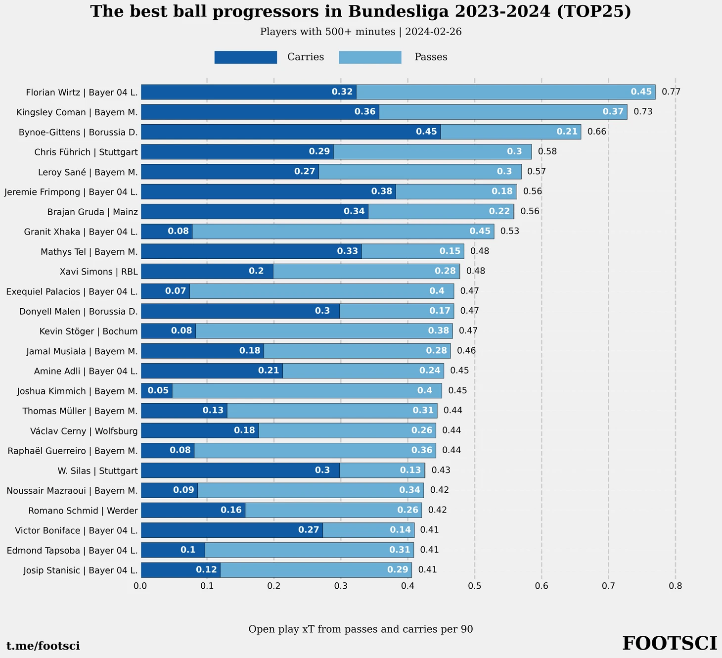 Байно-Гиттенс уверено лидирует в Бундеслиге и находится на пятой позиции в Европе по данному показателю. Англичанин ожидаемо пропускает вперед Доку и Винисиуса с их космическими 0.84 и 0.61 xT для carries. Однако отставание от следующих за ними Мартинелли (0.47) и Родриго (0.46) довольно условно. Одна-две неудачные игры у одного из футболистов и распределение в этой тройке может измениться.