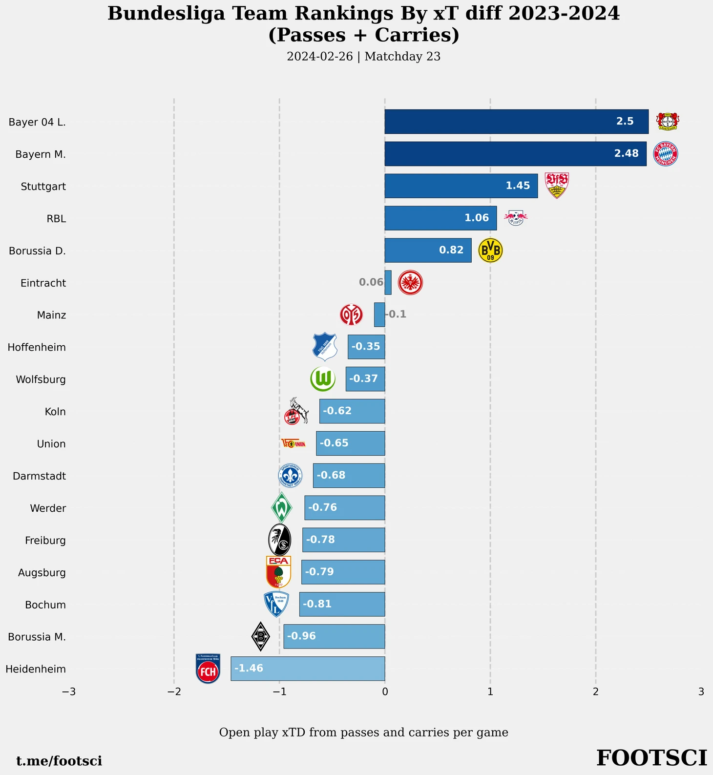 Для Штутгарта же наблюдаются накапливающиеся проблемы с эффективностью игры в защите. По xG и xT команда демонстрирует минимальную положительную разницу между ожидаемыми забитыми и пропущенными. Судя по графикам, причиной тому является повышение значений метрик у своих ворот при сохранении эффективности в атаке на прежнем уровне. Теперь предлагаю рассмотреть все команды Бундеслиги, отсортированные по средней создаваемой опасности по xT за матч.