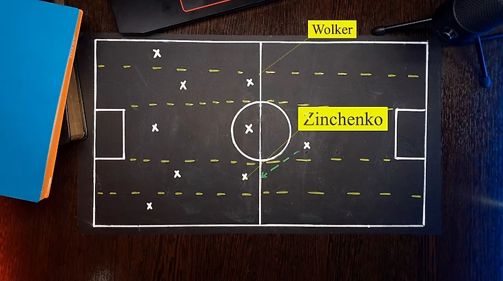 И мы видим, что у Гвардиолы и его команды это отлично работает и на практике. На стоп кадре один в один ситуация, которую мы разбирали ранее, за исключением того, что Де Брюйне принимает мяч на противоположно фланге.