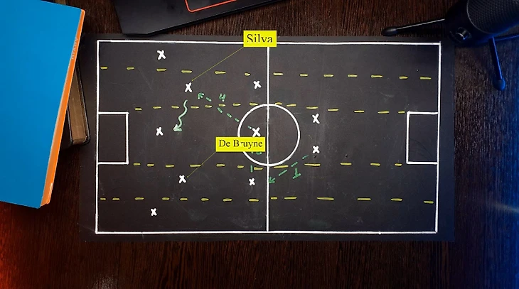 Де Брюйне и Сильва получают мяч на чужой половине поля в зонах полуфланга. Оттуда они уже находят партнёра передачей за спину оборонительной линии, либо при свободном пространстве продвигаются сами.