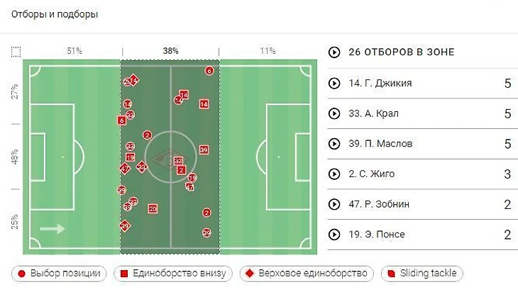 Это приводило к тому, что спартаковцы стали совершать большое количество ошибок и потерь. Бакаев в средней части поля в первом тайме отметился наибольшей регулярностью таких действий: