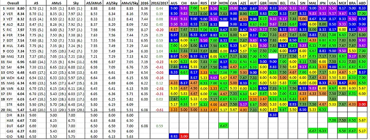 После каждого Гран-при авторитетные автоспортивные медиагиганты Autosport, Sky Sports F1 и Auto Motor und Sport выставляют оценки гонщикам по десятибалльной шкале. Теперь, с концом сезона, появилась возможность собрать мнение экспертов, рассчитать средние значения для каждого пилота и определить, кто же стал лучшим по мнению зарубежных журналистов — даже сравнив с показателями прошлого года.