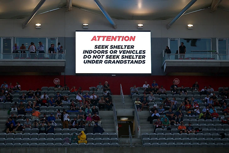Однако затем началась гроза, персонал трассы эвакуировали, а болельщиков попросили найти укрытие от молний.