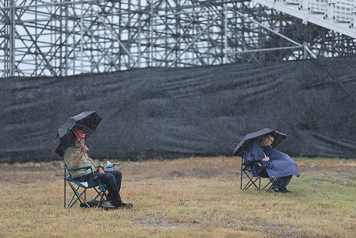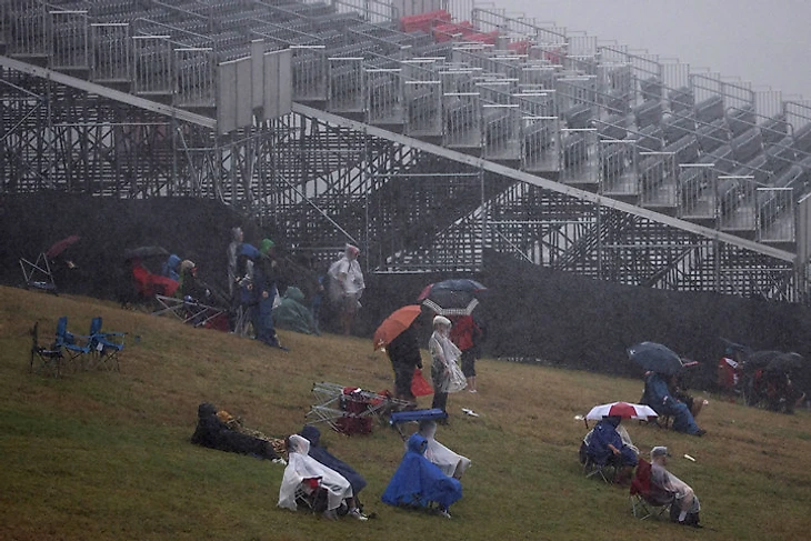 Но гонщики хотя бы находились в теплых боксах, а вот фанаты мокли под дождем.
