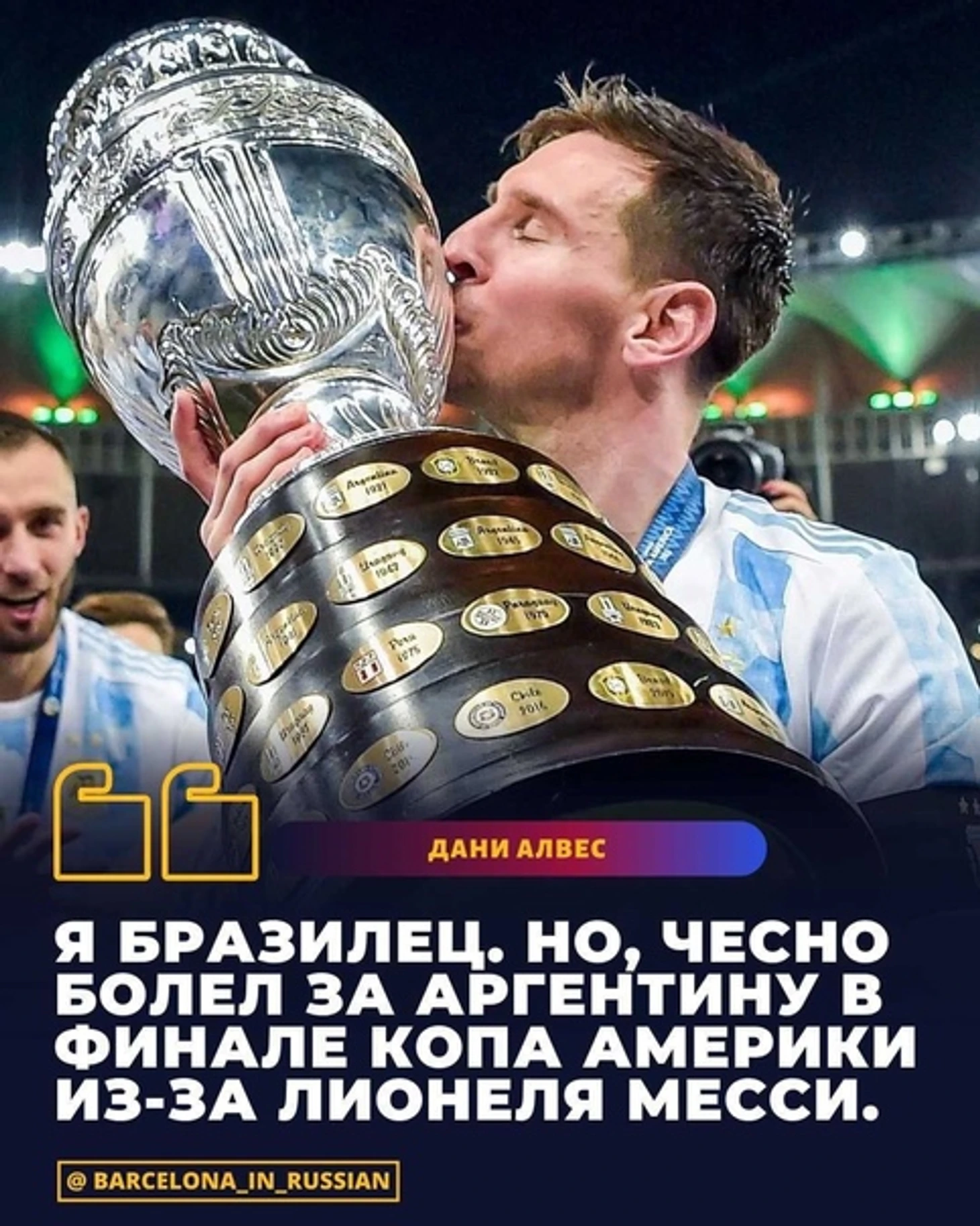 Бразильская журналистка Фабиола Андраде - "Позвольте мне объяснить: я люблю Бразилию, бразильский футбол и не думаю, что национальность определяет характер человека. У меня есть несколько друзей-аргентинцев. Но я буду болеть за Аргентину в финале Кубка Америки не из-за них. Болею, люблю #футбол и человека @leomessi Этот парень должен выиграть титул в футболке своей страны! За справедливость! Я хочу, чтобы соперник был силен и победил! Крупнейшее суперкласико в мире! Следую всегда, мое сердце, мой разум и то, что я думаю, что это правильно... Бразилия только что была чемпионом Южной Америки... теперь я оставляю этот титул для Leo ♥️ "