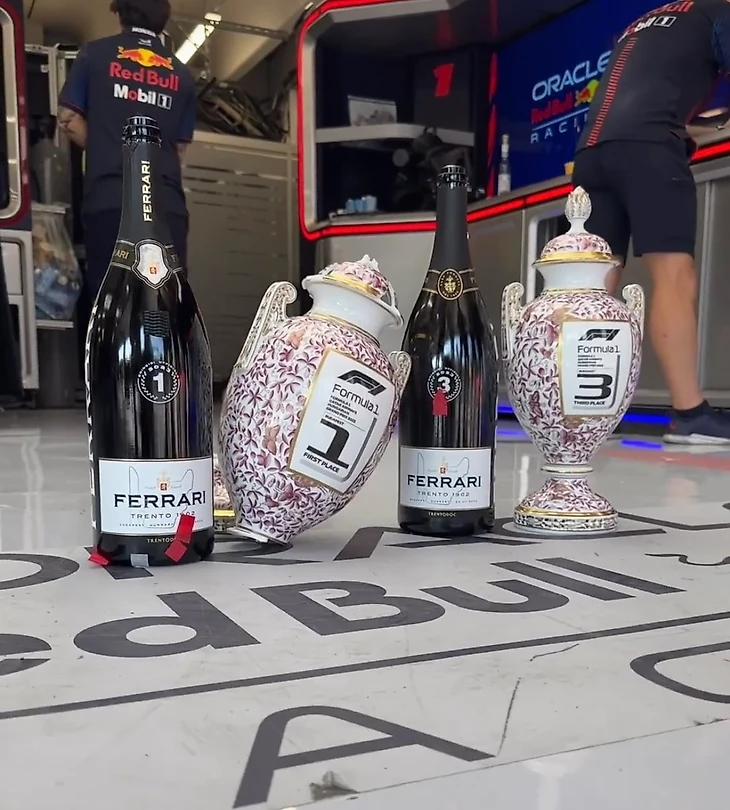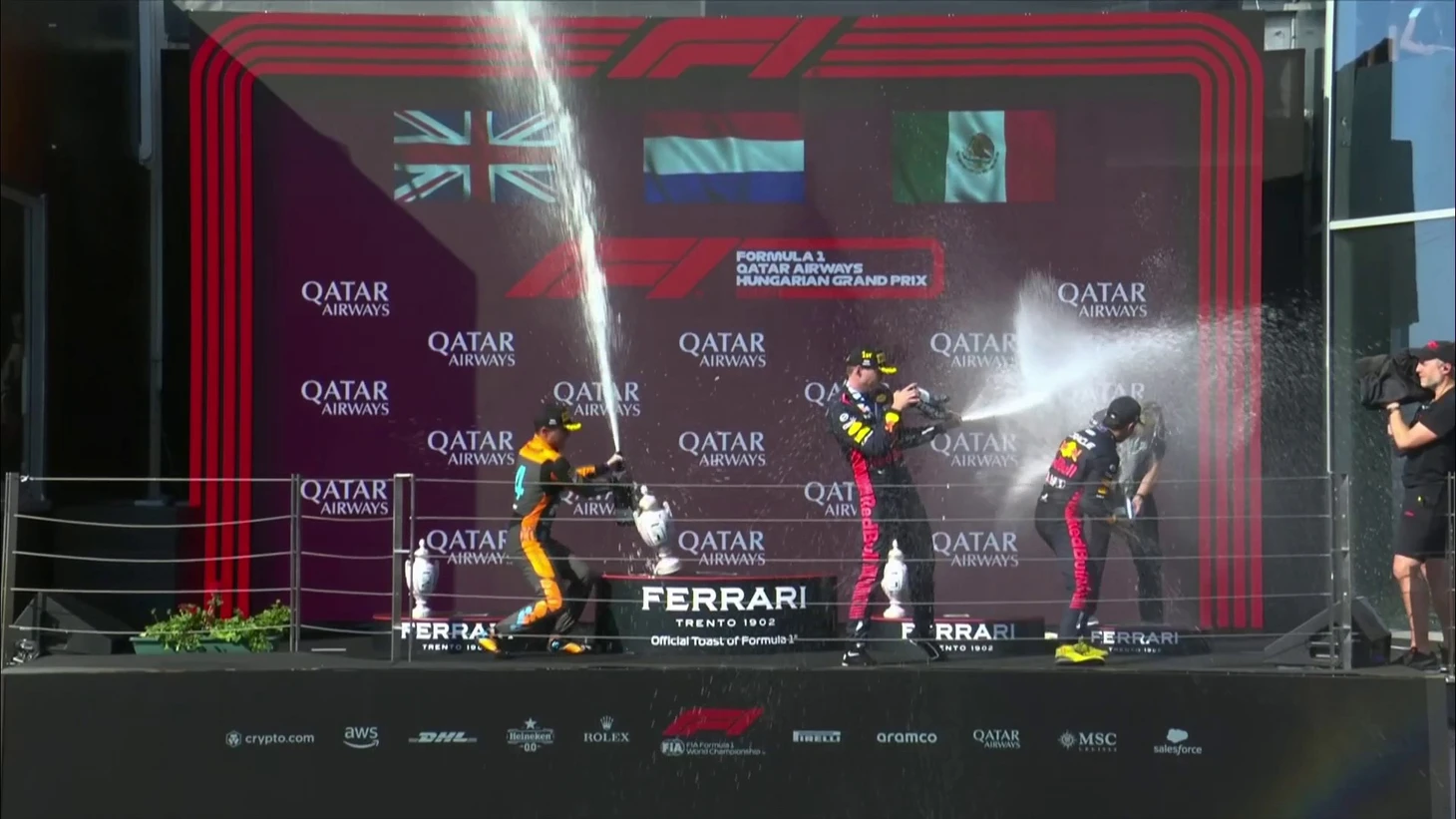На подиуме Ландо Норрис решил устроить шоу. Устроил, но разбомбил чемпионский кубок Макса.