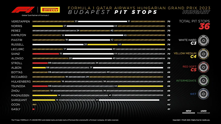 Статистика пит-стопов Гран-при Венгрии от Pirelli. всего остановок было 36, больше 2 не совершил никто.