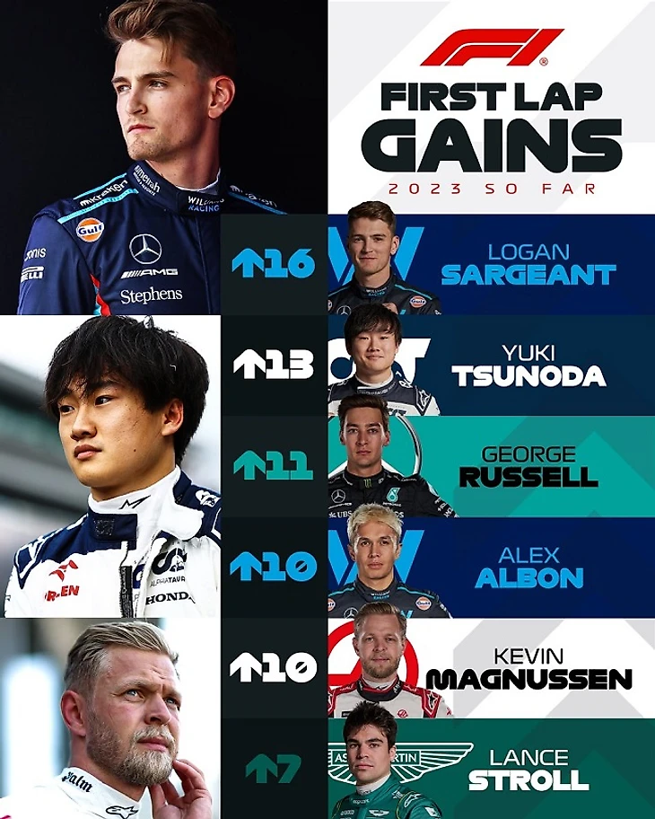 22-летний американец за 12 заездов поднялся на 16 мест в тайминге на первых кругах. Второе место в перечне с 13 выигранными позициями занимает Юки Цунода.